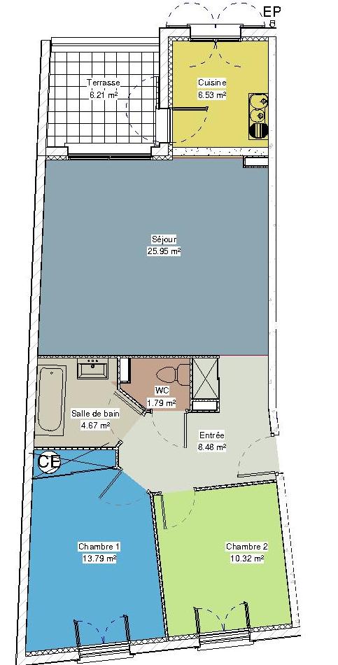 Appartement de Type 3 de 71,53 m2 situé au premier étage avec une terrasse donnant sur le jardin :